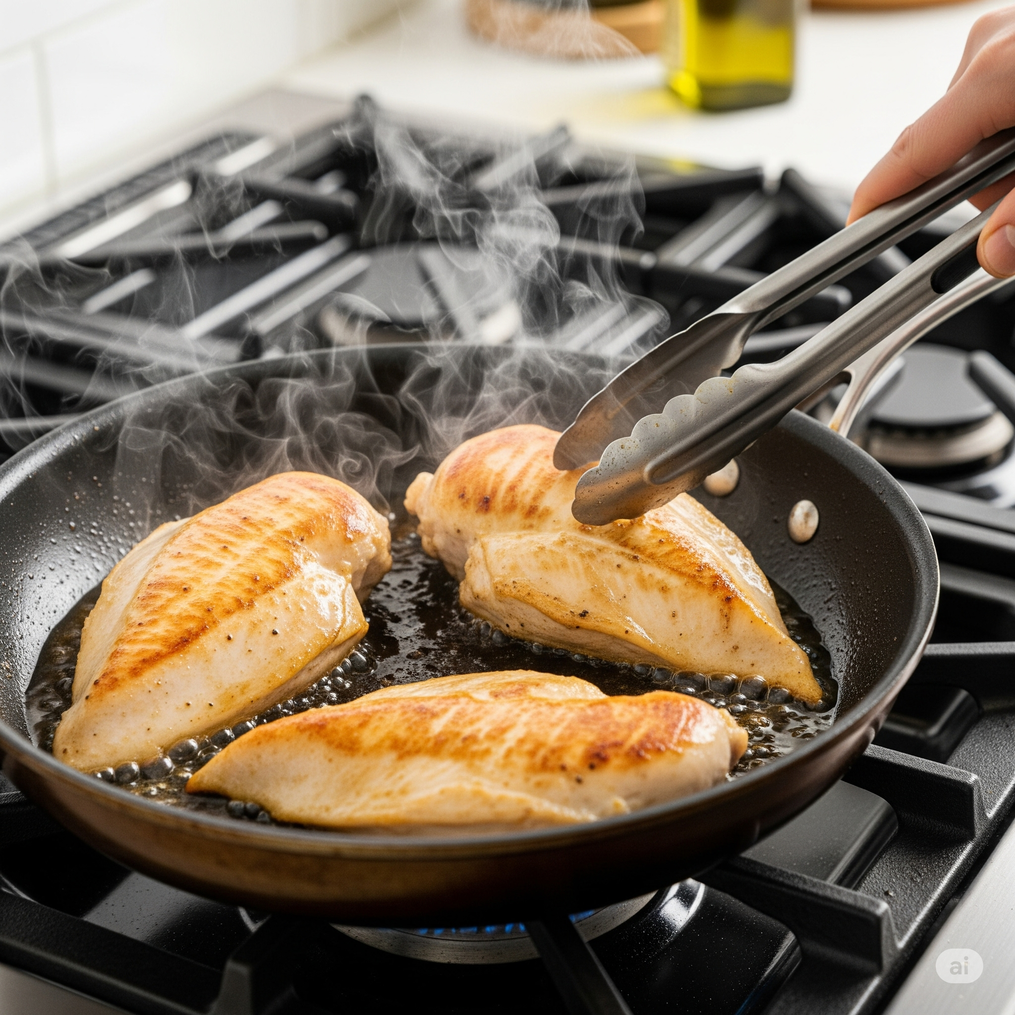 Pat chicken dry. Season with salt and pepper. Heat 2 tbsp olive oil in a skillet over medium-high heat. Sear chicken 4–5 minutes per side until fully cooked (165°F internal temp). Let rest 2–3 minutes, then slice thinly.