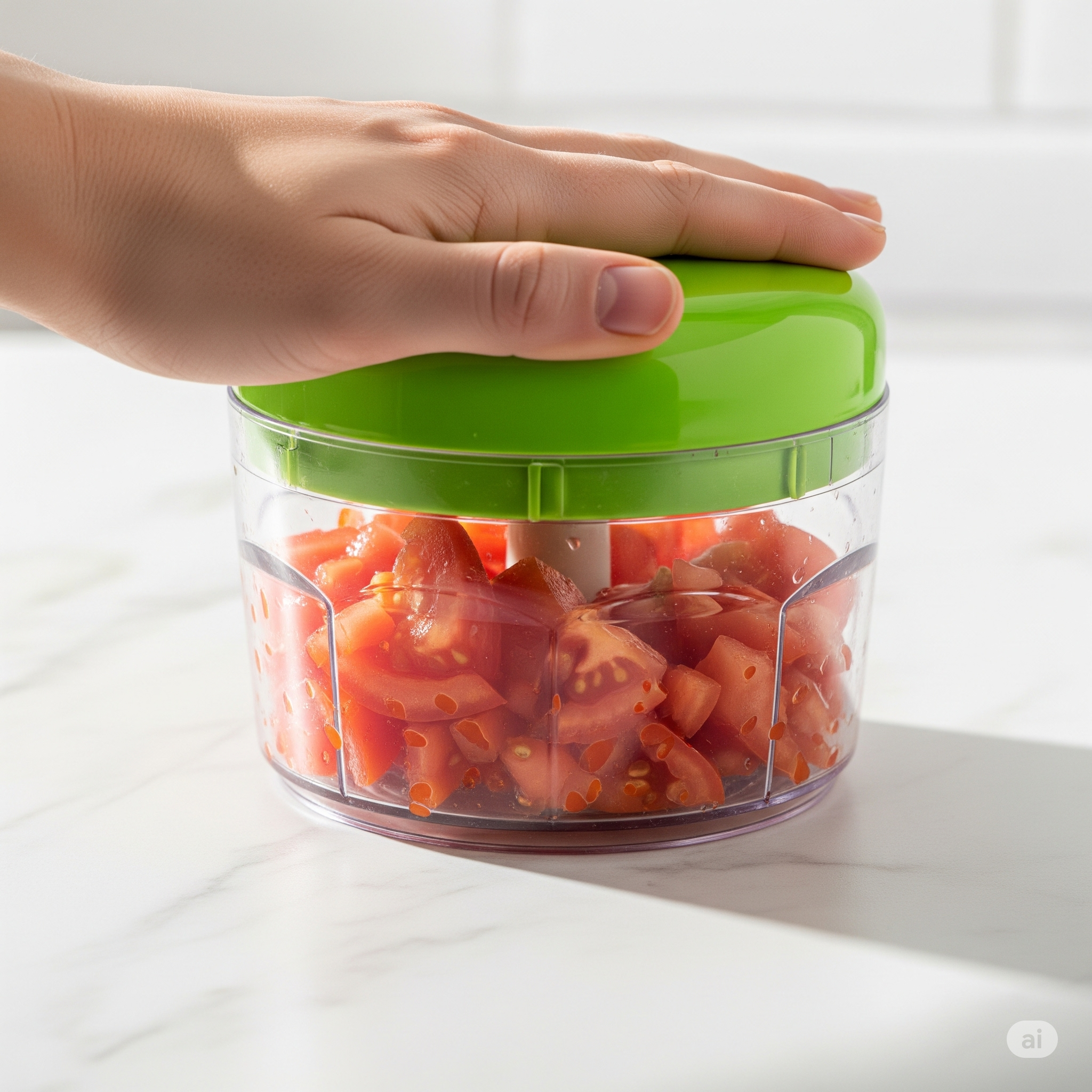 Finely chop roma tomatoes using a vegetable chopper for even, juicy bites.This adds brightness and balances the creamy dressing.